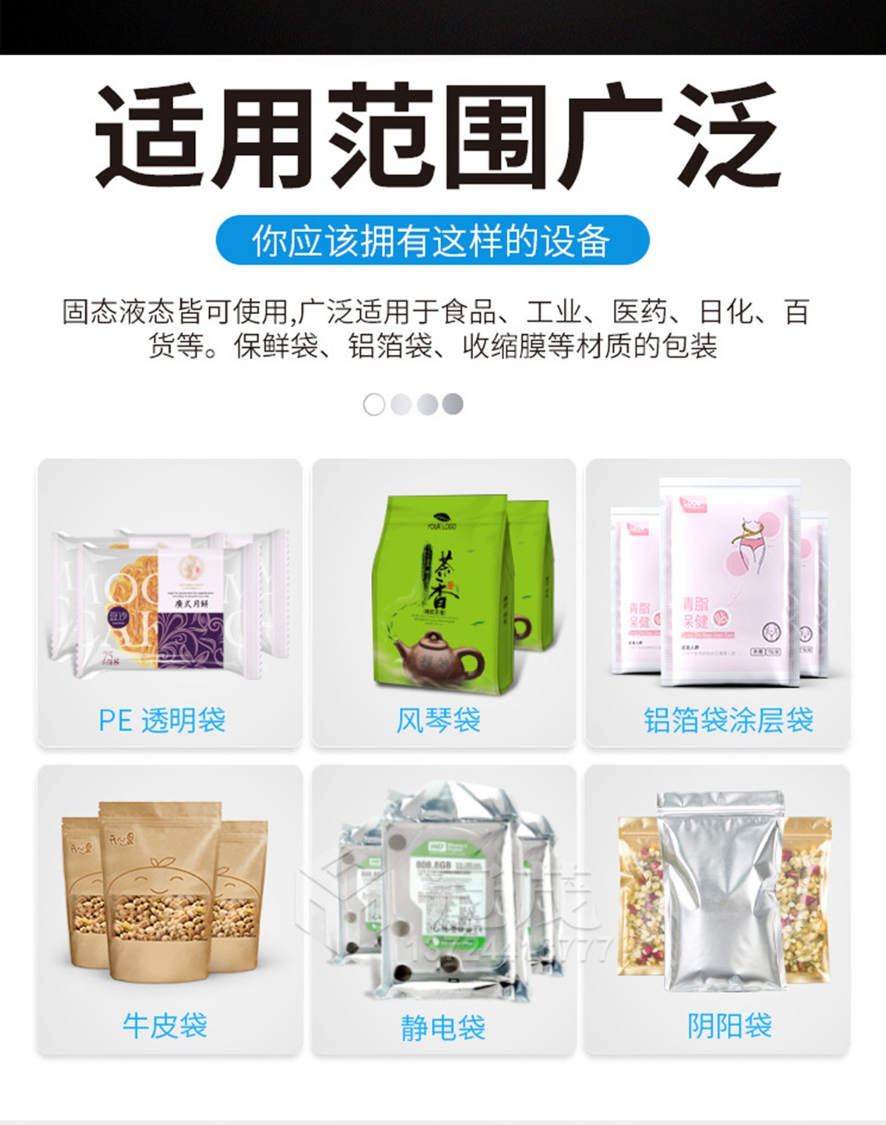 食品行業(yè):用于袋裝零食、咖啡、調(diào)味品、堅(jiān)果、干果、冷凍食品等的封口包裝,保證食品的新鮮度和衛(wèi)生安全。