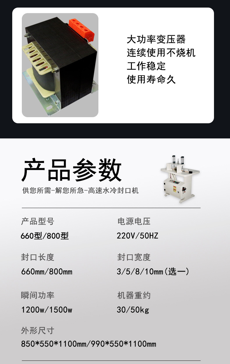 在實際應用中,用戶需根據膜材類型、包裝需求選擇合適參數。日常維護需關注水壓、加熱條清潔,定期進行管道除垢、設備檢修。隨著技術發展,水冷封口機正朝著智能化、綠色化方向升級,如集成 AI 視覺檢測、實現余熱回收,進一步提升設備性能與環保效益。