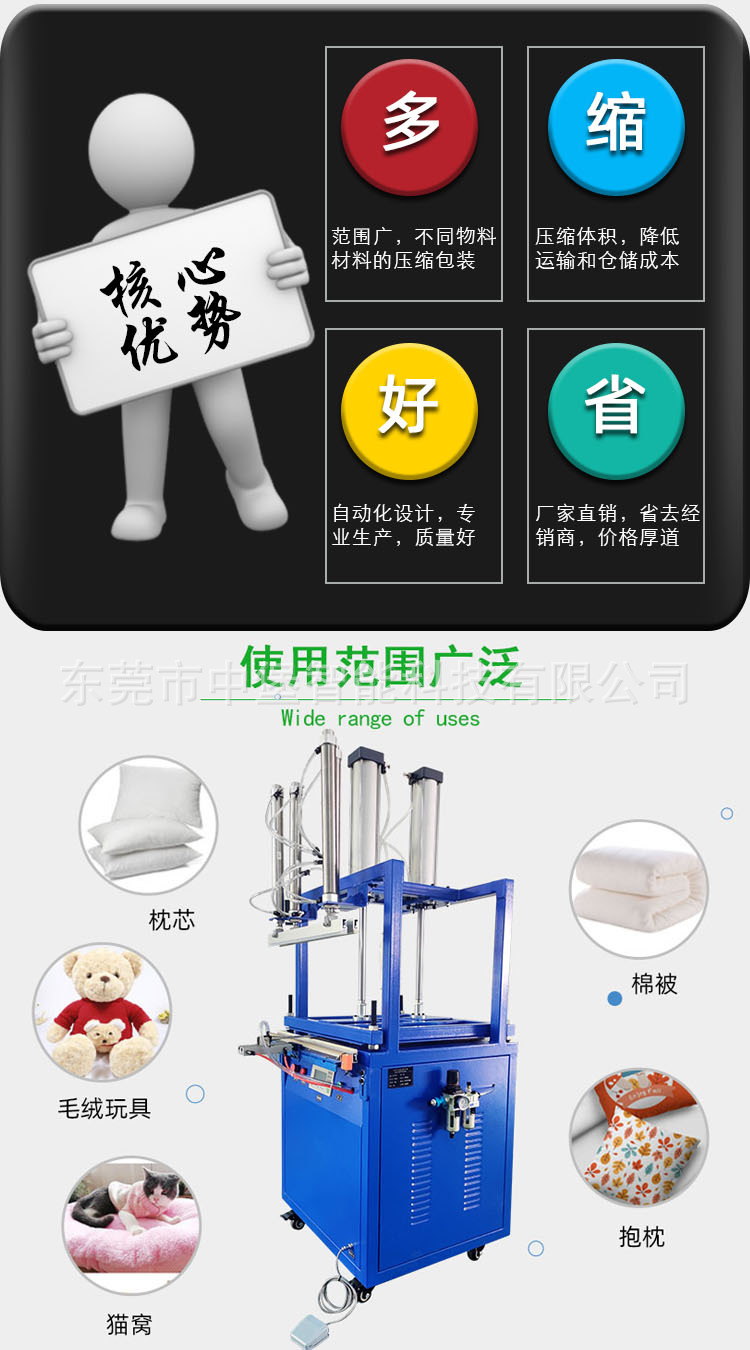 壓縮封口機是一類集成 “壓縮物品體積” 與 “密封包裝開口” 功能的設備,通過壓縮減少物品占用空間后,對包裝材料進行密封處理,確保壓縮狀態(tài)穩(wěn)定,防止物品回彈、漏氣或受污染,廣泛應用于食品、家紡、工業(yè)物料、物流等領域。以下從設備原理、分類、使用要點等方面詳細說明: