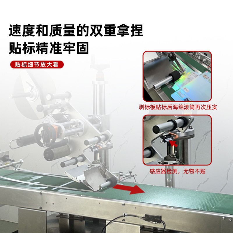 緊接著,分離后的標簽或產品快速進入貼標環節。貼標機構采用先進的傳感技術與高精度貼標頭,當產品通過輸送線到達指定貼標位置時,傳感器瞬間捕捉到信號,并即刻將指令傳達至貼標頭。貼標頭以極快的響應速度,將標簽從卷狀材料上精準剝離,隨后以恰到好處的壓力和速度,將標簽平整、牢固地貼附在產品表面。整個貼標過程一氣呵成,動作流暢且連貫,幾乎沒有絲毫停頓。