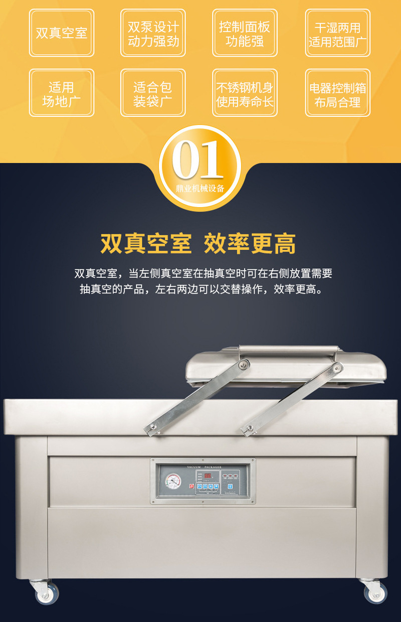 - 高效生產:雙室交替工作,大大縮短了包裝周期,提高了生產效率。特別適用于大規模生產和連續作業。