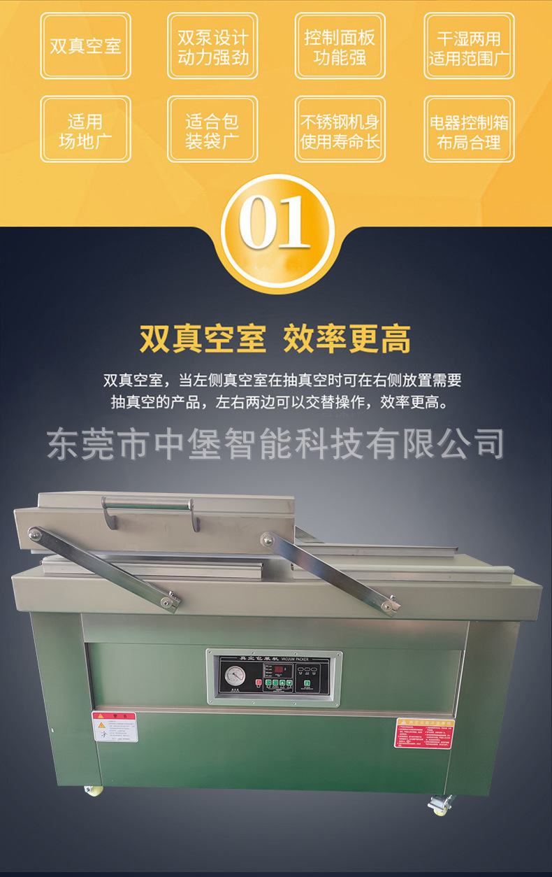 - 考慮需要包裝產品的最大尺寸。雙室真空包裝機的真空室有一定的尺寸限制,要確保產品和包裝袋能夠順利放入真空室進行包裝。同時,還要考慮包裝的類型,是普通的三邊封、四邊封還是異形包裝等。有些機器可能對特定的包裝類型支持更好,例如,帶有異形模具的雙室真空包裝機可以更好地處理異形包裝袋。