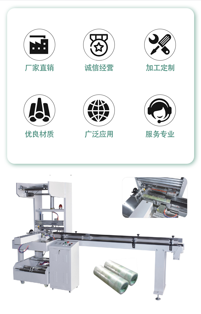 進料:首先通過進料裝置將膠帶卷有序地輸送到包裝區域。進料裝置一般有輸送帶,能夠穩定地把膠帶卷按照一定的間距逐個傳送,確保膠帶卷能準確進入下一個包裝環節。