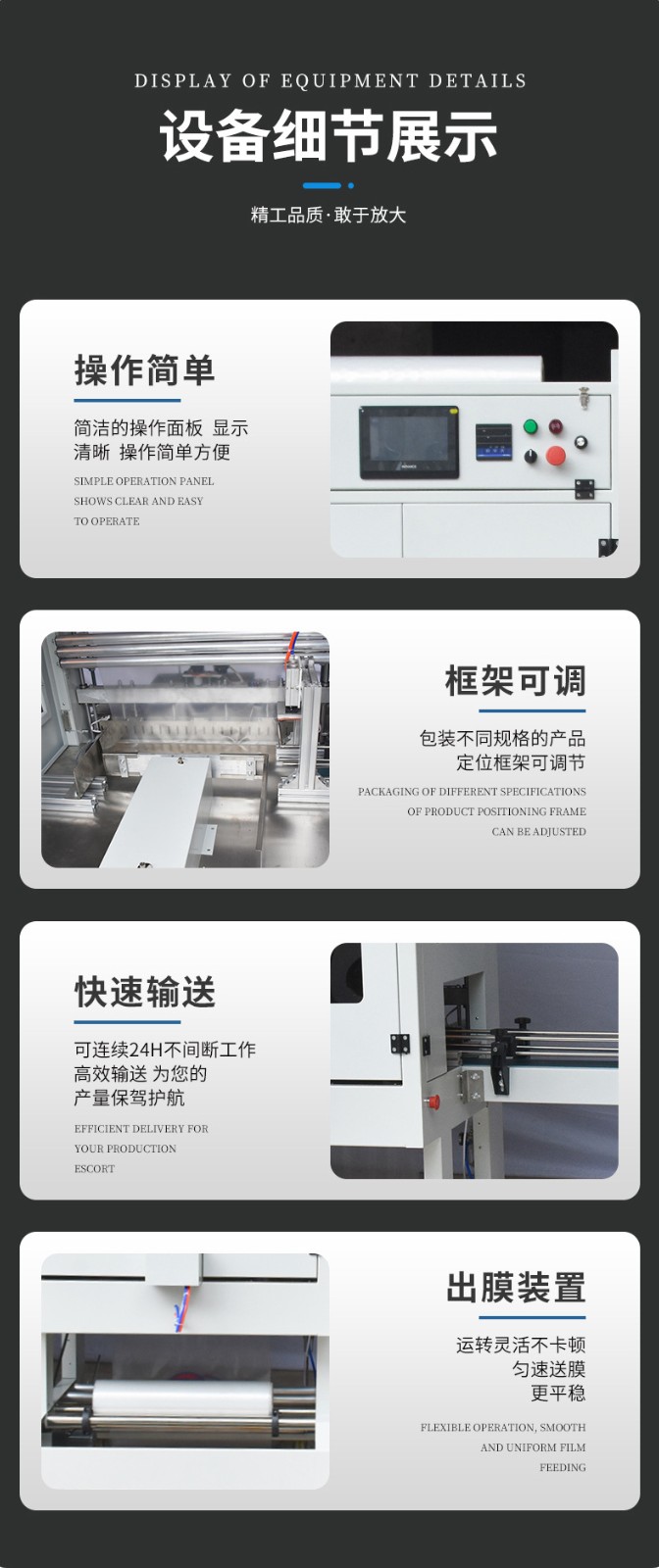 高包裝速度:其包裝速度相當可觀,一般來說,根據產品的大小、包裝材料的特性和包裝形式等因素,每分鐘可以包裝幾十件甚至上百件產品。這對于大規模生產企業來說,可以在短時間內完成大量產品的包裝任務,有效滿足市場需求