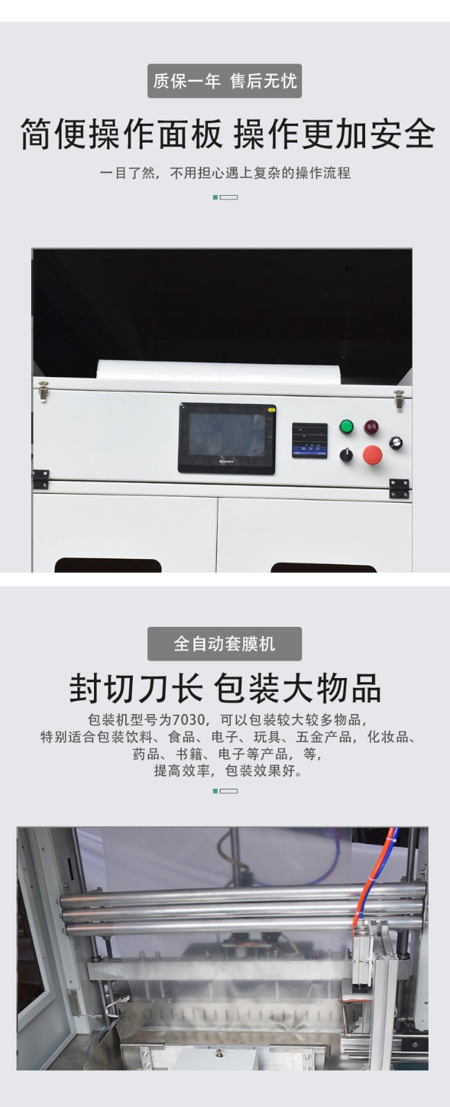 高度自動化流程:全自動袖口式包裝機能夠自動完成從產品輸送、包裝材料成型、產品套入包裝材料,到封口、切斷等一整套包裝流程。例如,在食品包裝生產線中,產品通過輸送帶自動進入包裝機,包裝機自動將塑料薄膜制成合適的包裝形狀,把產品包裹進去,然后精準地封口和切斷包裝,整個過程無需人工干預,極大地提高了生產效率。
