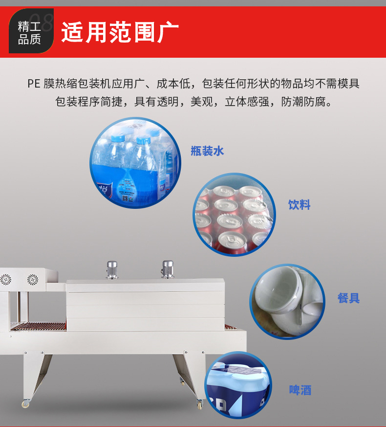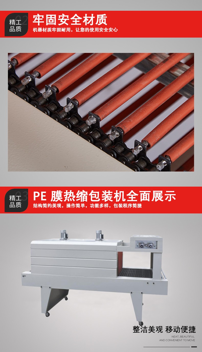 • 適用范圍廣:可以用于包裝各種形狀和尺寸的產品,無論是規則的圓柱體、長方體,還是不規則的產品,只要選擇合適的 PE 薄膜,都可以用這種機器進行包裝。而且它可以與其他包裝設備和生產線集成,實現自動化包裝,提高生產效率。