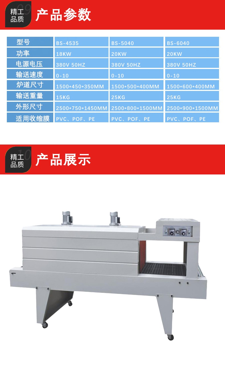 • 輸送系統:主要包括輸送帶和驅動電機。輸送帶用于承載和輸送被包裝的產品,其材質通常是耐高溫的橡膠或特殊的合成材料,以適應加熱區域的高溫環境。驅動電機能夠精確控制輸送帶的速度,從而調整產品在加熱區域的停留時間,以滿足不同產品和薄膜的收縮要求。