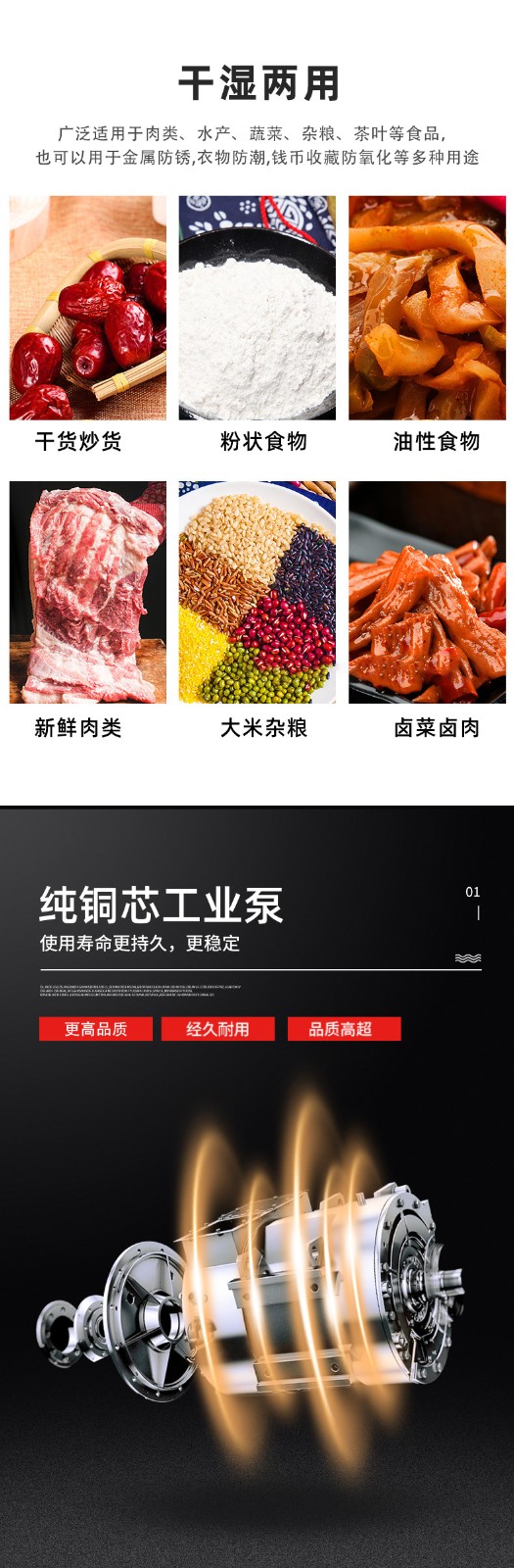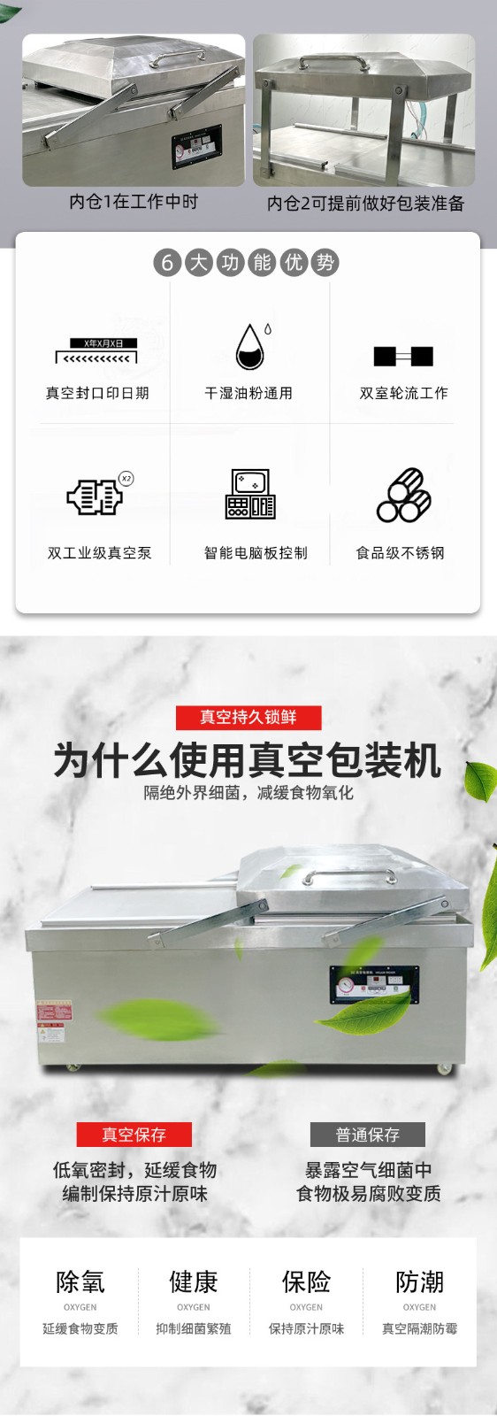 - 高效工作:采用雙室交替工作方式,當一個真空室在抽真空時,另一個真空室可以擺放包裝物,極大地提高了工作效率,適用于較大規(guī)模生產型企業(yè)7。