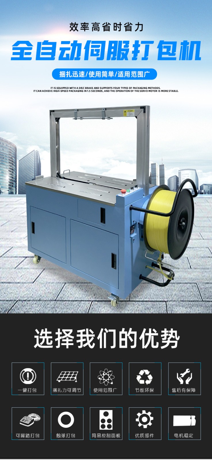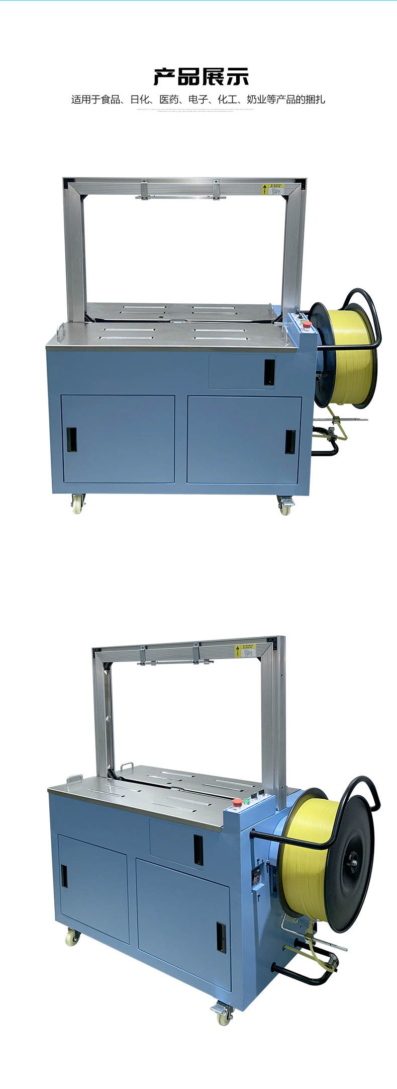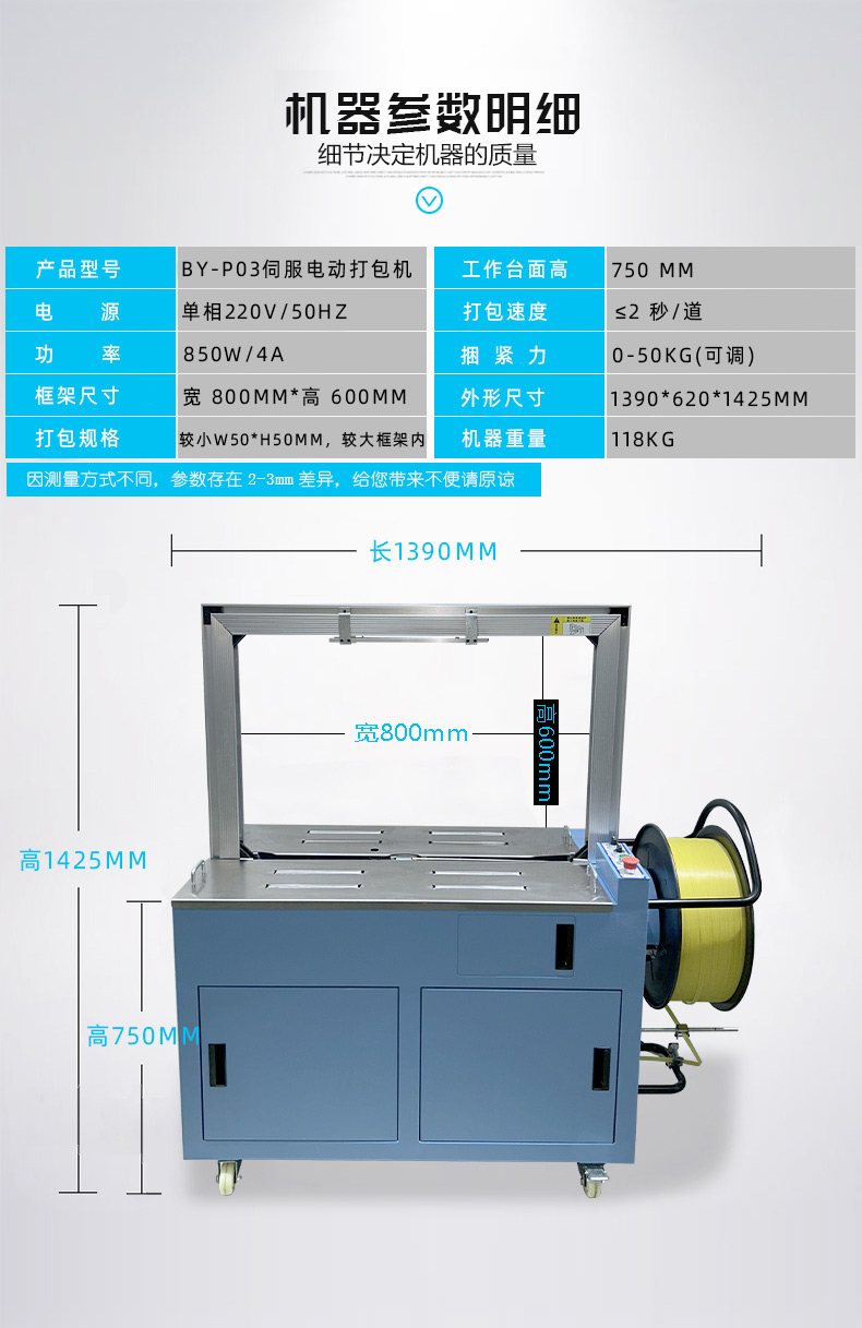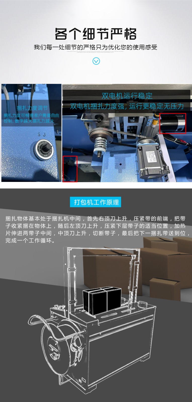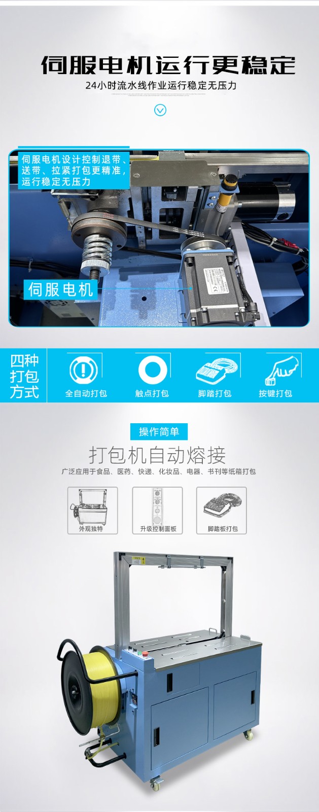 結構組成 伺服電機:作為核心部件,相比傳統電機,它能實現更高的控制精度和響應速度,可在捆扎時精準調整捆扎帶張力,保障捆扎的緊密與均勻。 控制系統:負責智能化管理整個捆扎流程。通過傳感器與程序控制,實時監測并調整捆扎速度、張力等參數,用戶還能依不同產品需求設定相應捆扎參數,滿足多樣化包裝需求。 捆扎裝置:一般采用熱合或熱熔方式固定捆扎帶。熱合是通過加熱使捆扎帶兩端熔合,形成牢固的捆扎效果,提高捆扎強度,防止運輸過程中松脫。 輸送系統:負責將待捆扎產品送入捆扎機,常與輸送帶或自動化生產線等其他生產設備聯動,形
