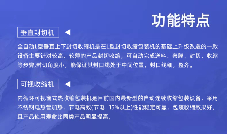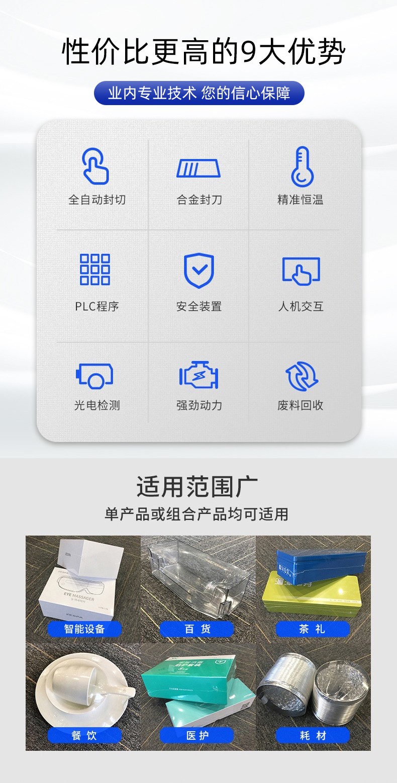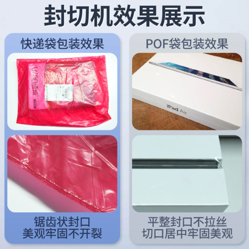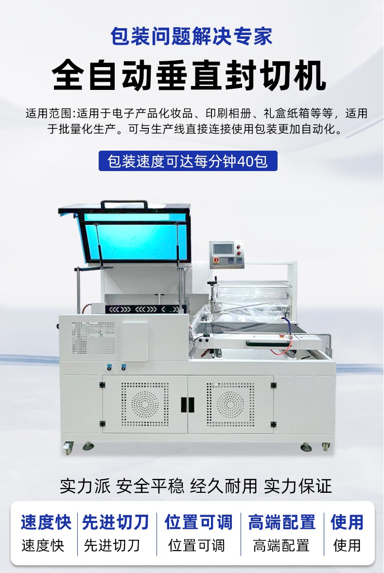 - 兼容異形產品:對帶弧度、凸起的產品(如洗發水、玩具),垂直封切可避免膜材拉扯變形,收縮后貼合度更高。