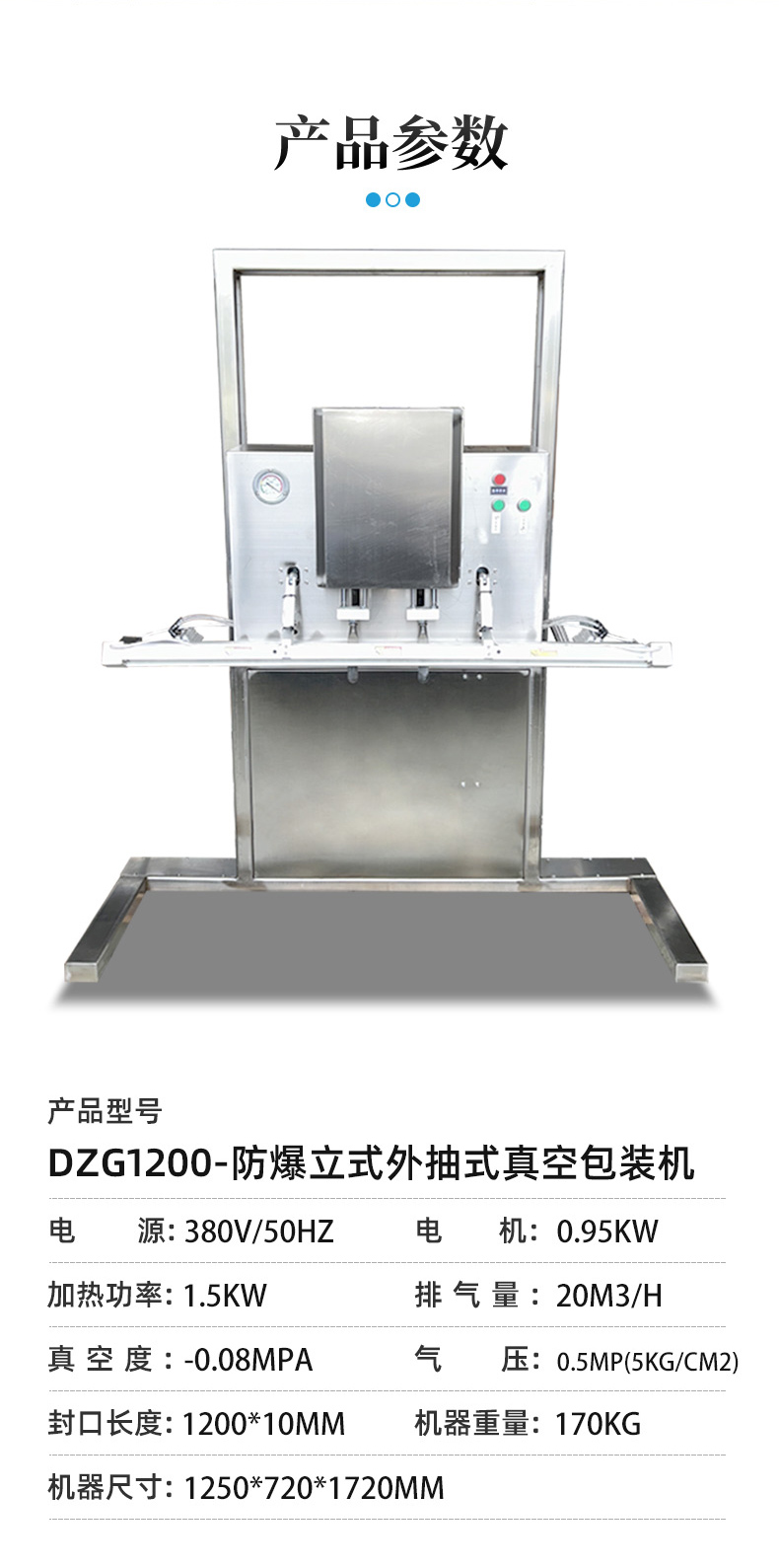 防爆立式外抽真空包裝機是在普通立式外抽真空包裝機的基礎上,采用了防爆技術,使其能夠在存在易燃易爆氣體、粉塵等危險環境中安全運行的包裝設備,主要用于化工、醫藥、制藥、民爆、實驗室、航天航空等領域中易燃易爆物品的包裝封口、儲存。 工作原理 將包裝物裝進復合塑料真空袋內,把真空包裝袋的袋口套在機器的抽氣嘴上。 啟動機器后,由上壓塊下壓,壓著袋口封閉,接著真空泵自動啟動抽氣,將包裝袋內的空氣抽出,抽至預設的真空度。 最后加壓、加熱使包裝袋口封合,完成真空包裝過程。 特點 防爆性能優越:采用物理隔離防爆技術,嚴格選
