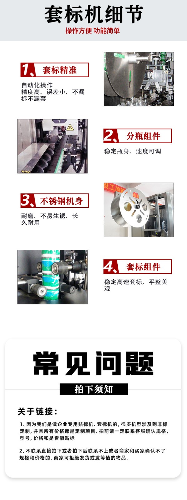 - 撥輪機(jī)構(gòu)通過(guò)伺服電機(jī)驅(qū)動(dòng),將容器調(diào)整為等間距(誤差≤1mm)、同方向排列,確保每個(gè)容器的套標(biāo)位置(如瓶頸、瓶身中部)與標(biāo)簽開口完全對(duì)應(yīng)。