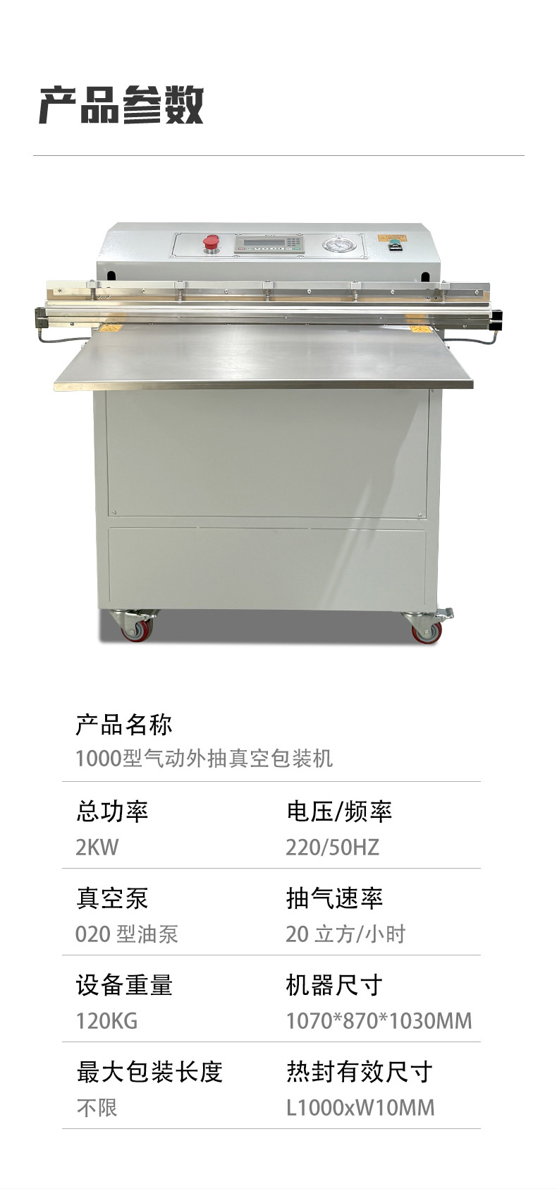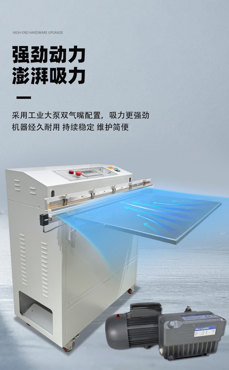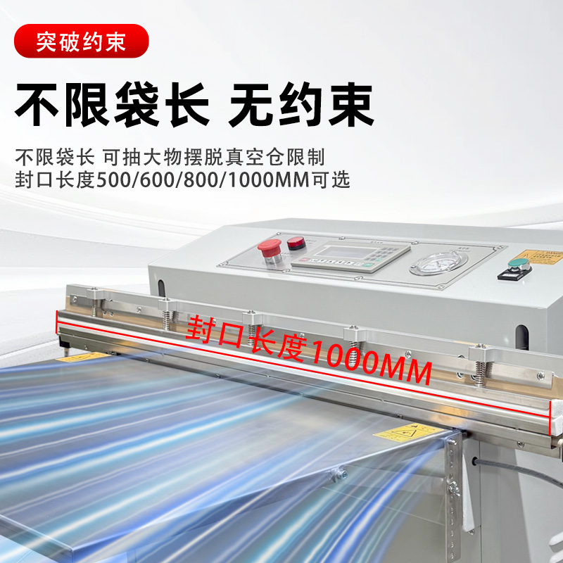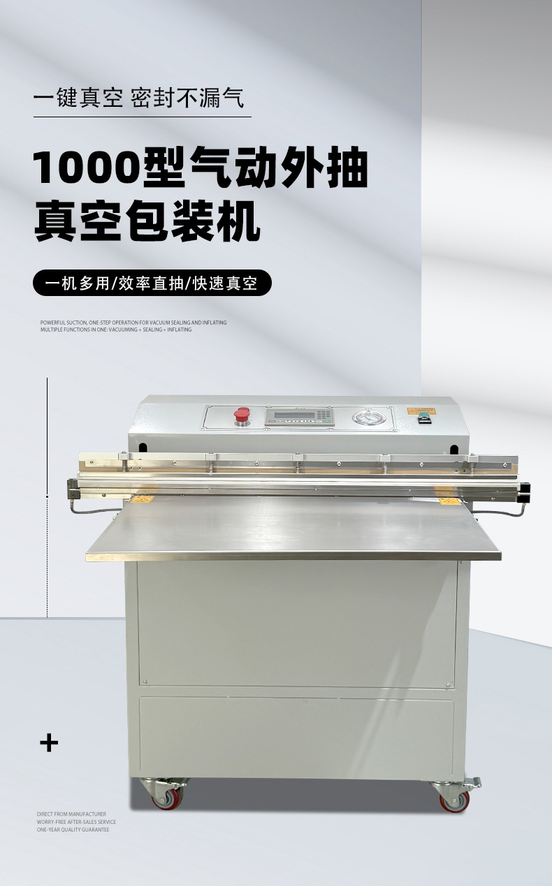 1000 型外抽真空包裝機是一款大尺寸外抽式真空設備,核心用于對體積較大、外形不規則或怕壓的物品進行真空包裝,通過外部抽氣實現防潮、防塵、保鮮或防銹保護。 1. 核心特點 包裝尺寸大:“1000 型” 通常指其有效包裝寬度約 1000mm,可容納大件物品,如整箱零件、大型布料、家具配件、工業組件等。 外抽式設計:抽真空組件在包裝腔外部,無需將物品完全放入密閉腔體內,能處理超出設備腔體尺寸的產品,也避免了內抽式設備對易碎、怕壓物品的擠壓。 適配性強:支持多種包裝材料,如 PE 復合膜、鋁箔膜等;可根據需求選