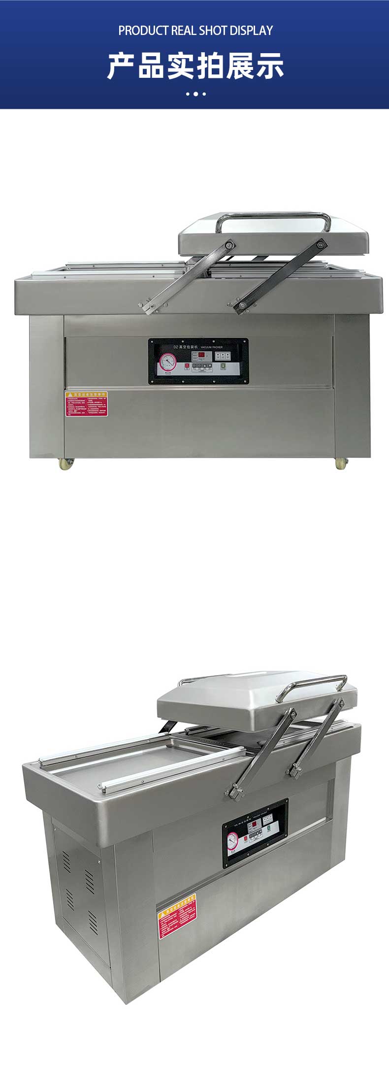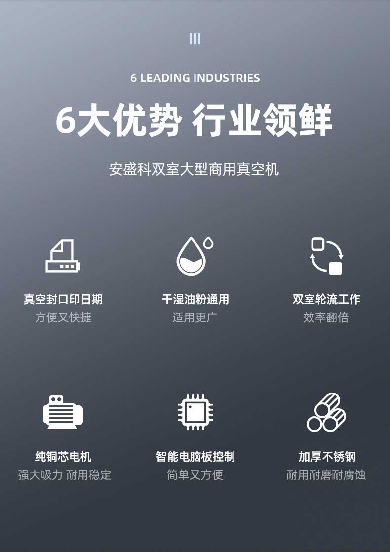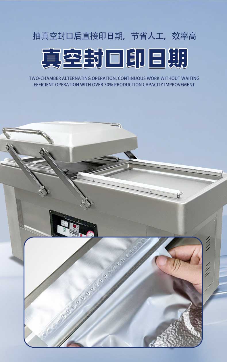 - 雙室設(shè)計:一個真空室在抽真空時,另一個真空室可以擺放包裝物,交替工作,節(jié)省操作時間,提高包裝效率。