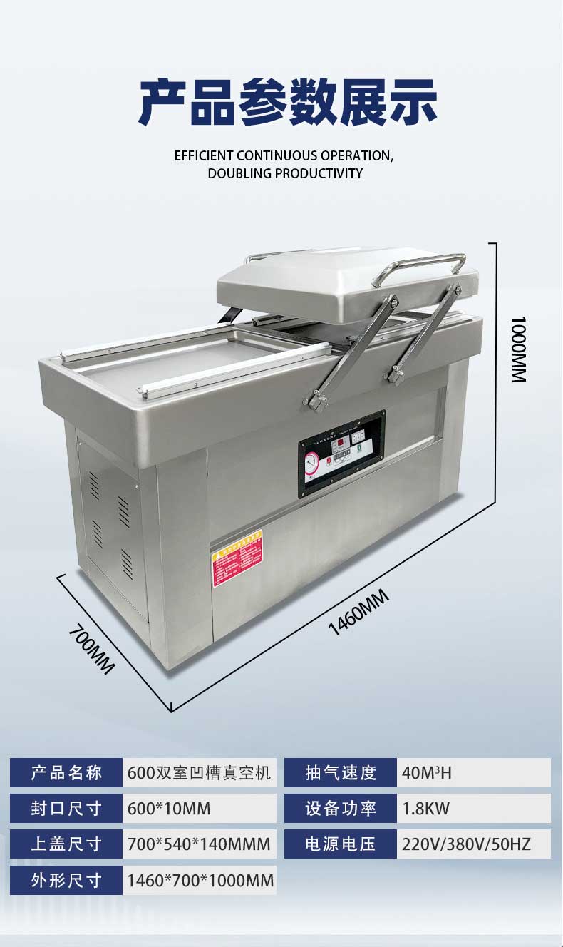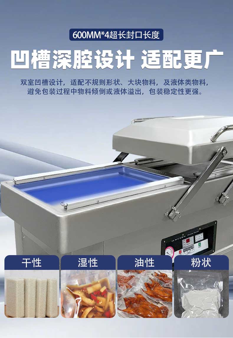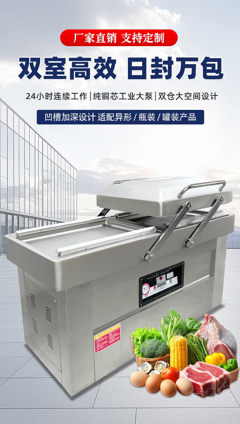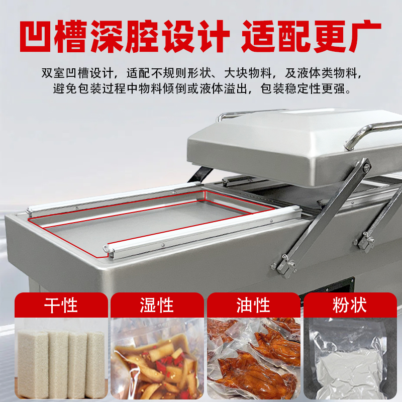 雙室凹槽真空包裝機(jī),專為鹵味、水產(chǎn)、預(yù)制菜等帶湯汁、高水分產(chǎn)品量身打造,創(chuàng)新下凹式真空室結(jié)構(gòu)搭配雙室交替工作模式,既解決液體包裝溢漏難題,又大幅提升生產(chǎn)效率,是食品加工、生鮮鎖鮮的得力設(shè)備。