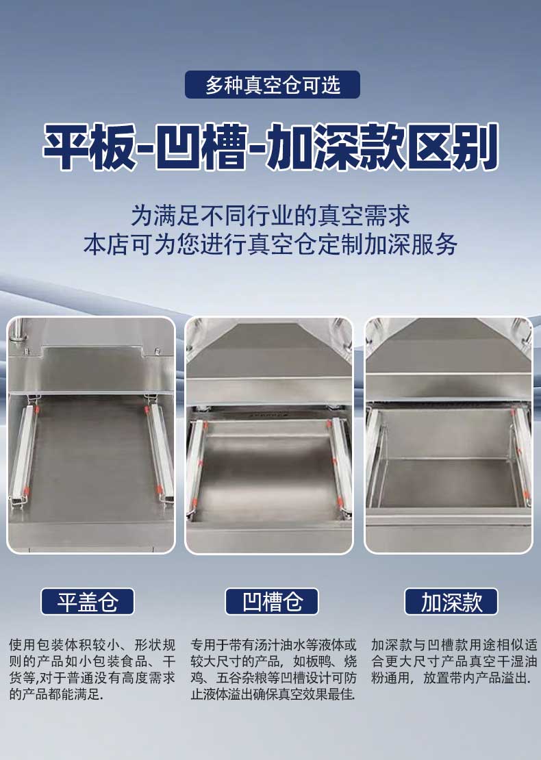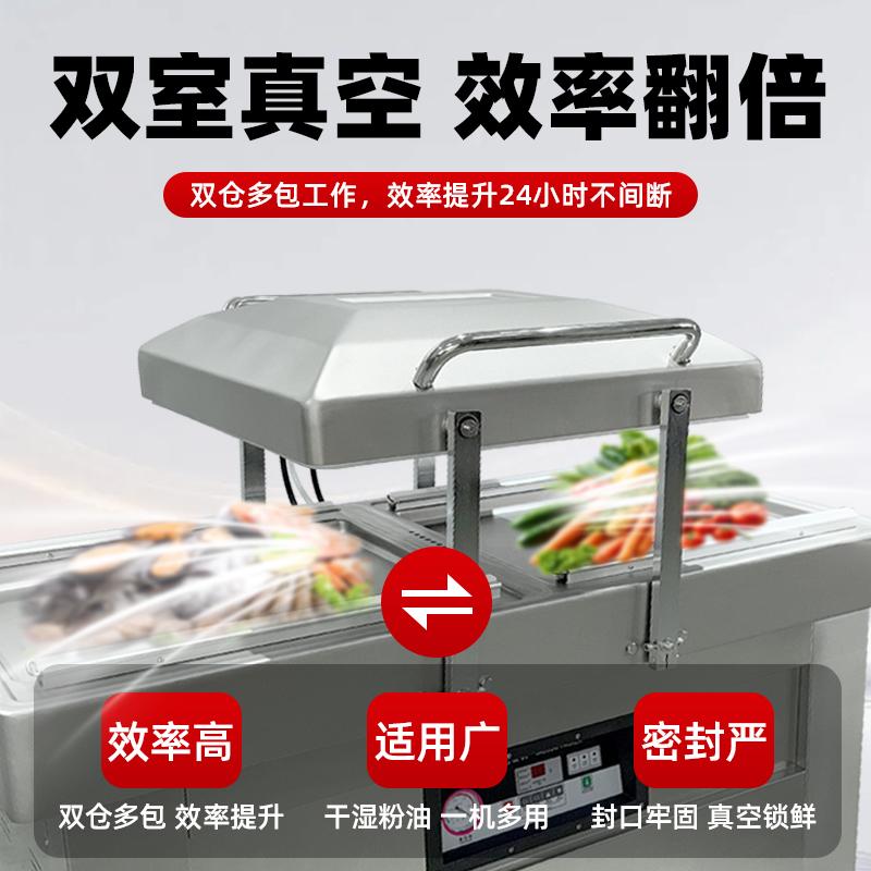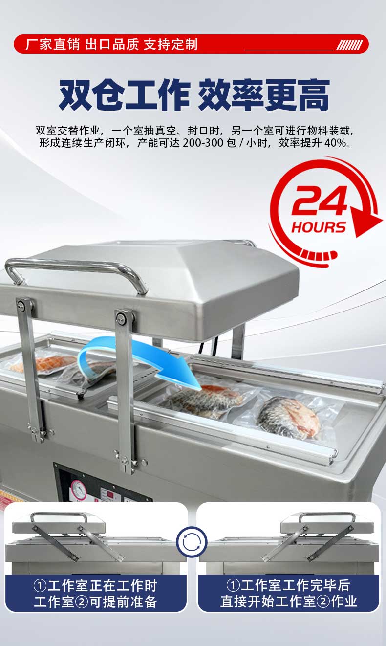 下凹式真空室深度支持定制,產(chǎn)品放置后呈傾斜狀態(tài),抽真空時湯汁牢牢鎖在凹槽內(nèi),不會流向封口處;傾斜適配的加熱條與硅膠條緊密貼合,封口平整牢固,杜絕漏封滲漏問題。雙室獨立運行設(shè)計,一個腔室抽真空封口的同時,另一個腔室可同步擺放待包裝產(chǎn)品,無縫銜接無空窗期,包裝效率較單室機(jī)型提升 50% 以上。