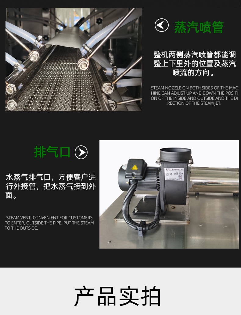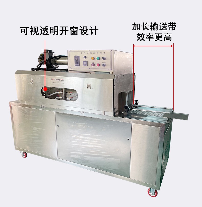 蒸汽收縮機利用蒸汽獨有的恒溫而且溫度擴散均勻的特性來工作,以達到普通電熱紅外加熱收縮機不可比擬的效果。設備采用加熱器加熱水而產生蒸汽,不需要另外配備蒸汽鍋爐。主機有主副2個加熱器,可以根據不同的生產速度來調節設備功率的大小,輸送帶采用無級調速,輸送速度可以任意調節。廣泛應用于大桶或小瓶裝礦泉水、純凈水;汽水和茶飲料等食品飲料行業,以及化妝品、洗發水和五金電子等需要收縮膜包裝的場合使用。