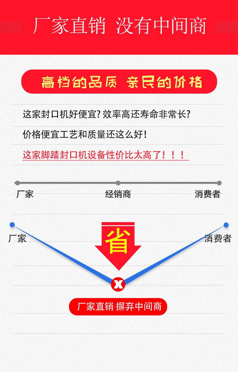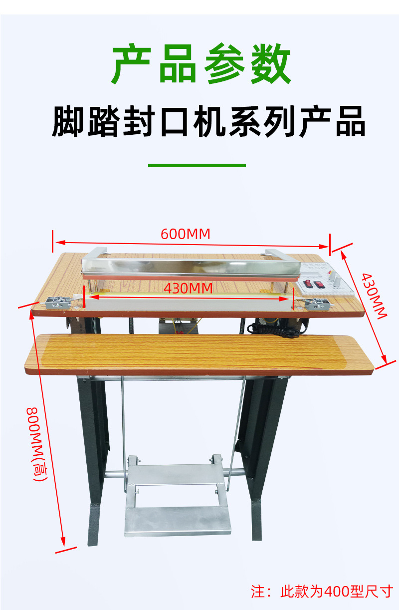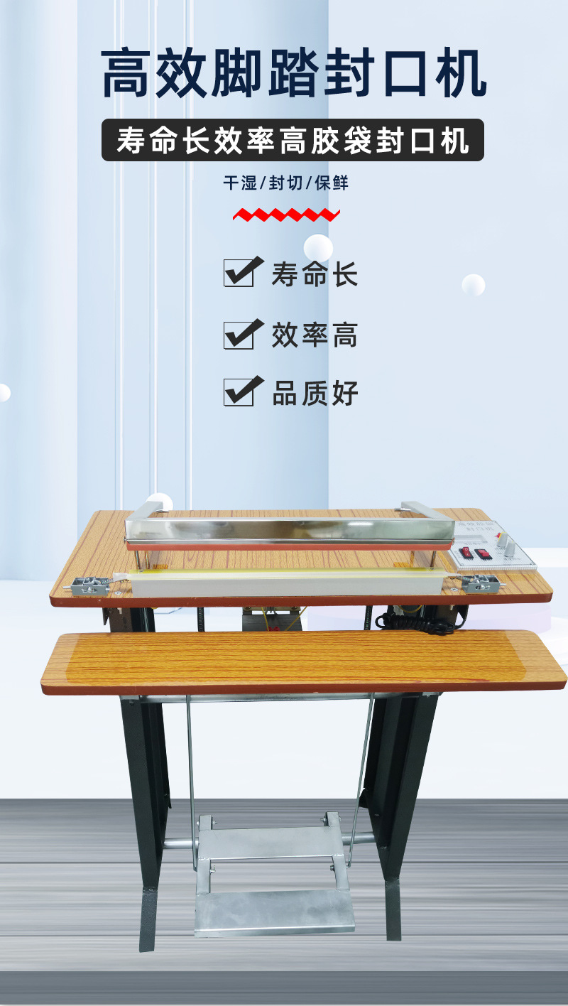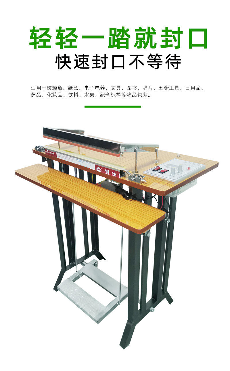 腳踏式封口機(jī)適用于各種塑料薄膜、復(fù)合薄膜及鋁塑薄膜的封合。產(chǎn)品簡(jiǎn)介 可廣泛應(yīng)用于食品、土特產(chǎn)、糖果、茶葉、醫(yī)藥、五金等行業(yè)。技術(shù)參數(shù) 產(chǎn)品優(yōu)點(diǎn) 1、本品適用于藥品,化妝品,保健品,食品,潤(rùn)滑油,農(nóng)藥,蜂蜜,瓜子,洗衣粉,大棗,調(diào)味品,雞精等