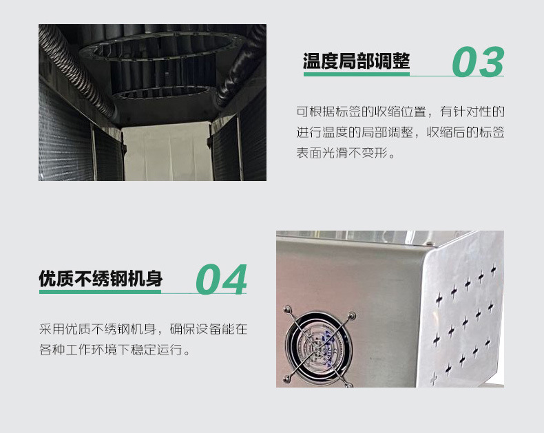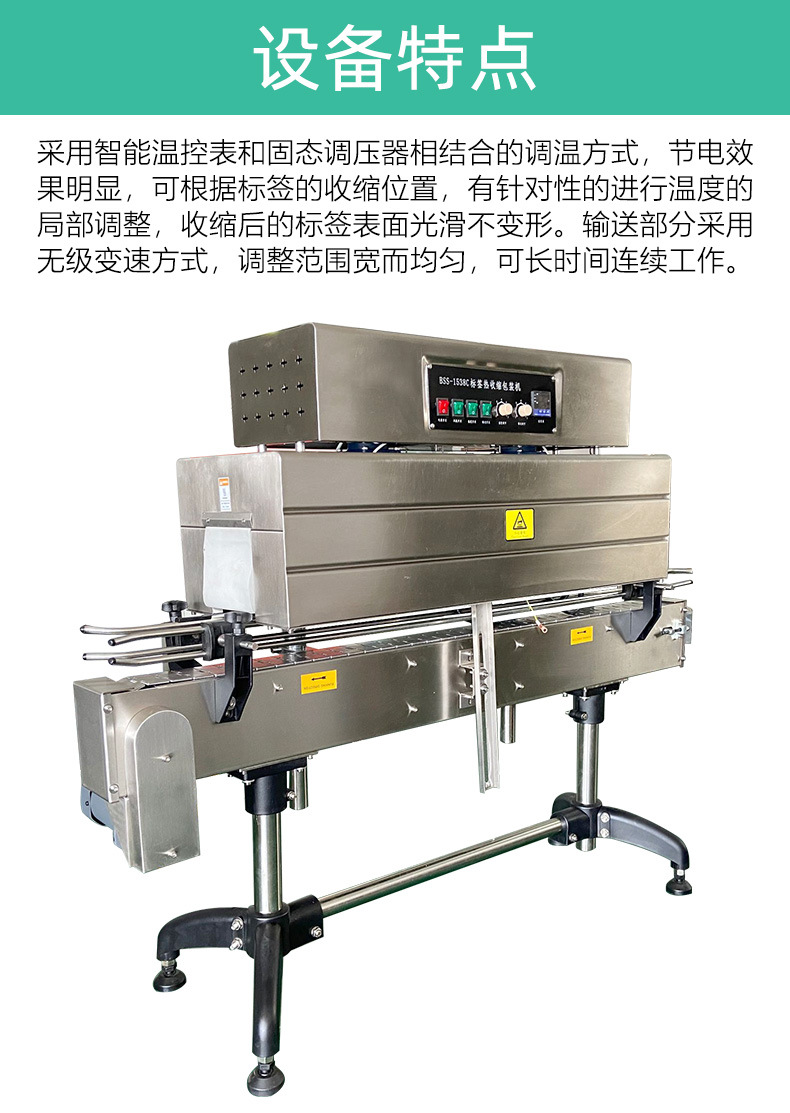 標簽熱收縮機的主要功能特點包括智能控制收縮溫度、?無級調整輸送速度、?確保輸送平穩、?360度旋轉受熱以確保收縮均勻。?