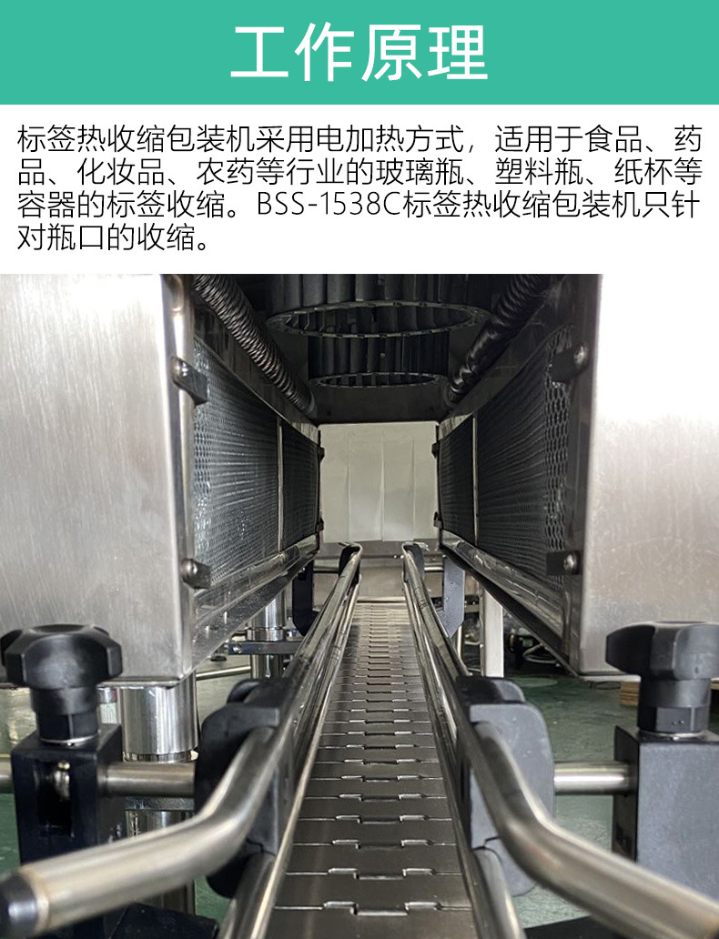 標簽熱收縮機的主要功能特點包括智能控制收縮溫度、?無級調整輸送速度、?確保輸送平穩、?360度旋轉受熱以確保收縮均勻。? 標簽熱收縮機是一種專門針對瓶狀、?罐狀、?桶狀杯狀產品的標簽進行收縮的設備,?能夠收縮瓶口、?瓶身、?瓶底以及整體。?它具有以下特點:? 智能控制收縮溫度:?通過智能控制系統,?可以精確調節收縮膜的加熱溫度,?確保包裝材料的最佳收縮效果。? 無級調整輸送速度:?通過電子調速器,?可以無級調整輸送速度,?以適應不同產品的包裝需求。? 獨特的輸送裝置:?確保產品在輸送過程中保持平穩,?